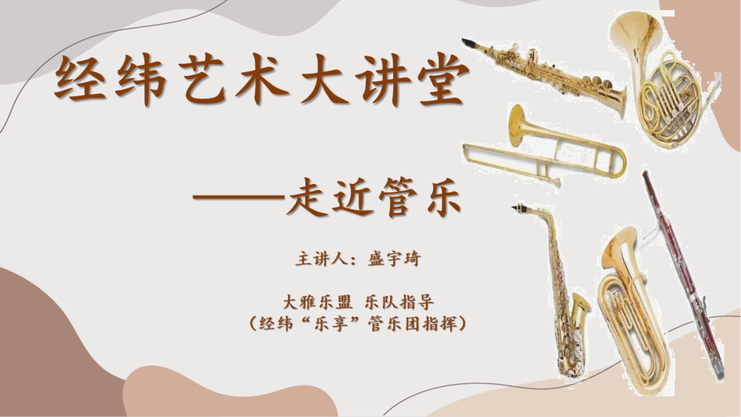 盛老师首先介绍了管乐团由来,讲解了管乐团中乐器的种类,让同学们对管乐有了一个初步的认识。此外,盛老师还播放了学校“乐享”管乐团在“新江南之春——2023管乐嘉年华暨中华杯中国第十六届优秀管乐队”比赛中的展演曲目《田园序曲》。