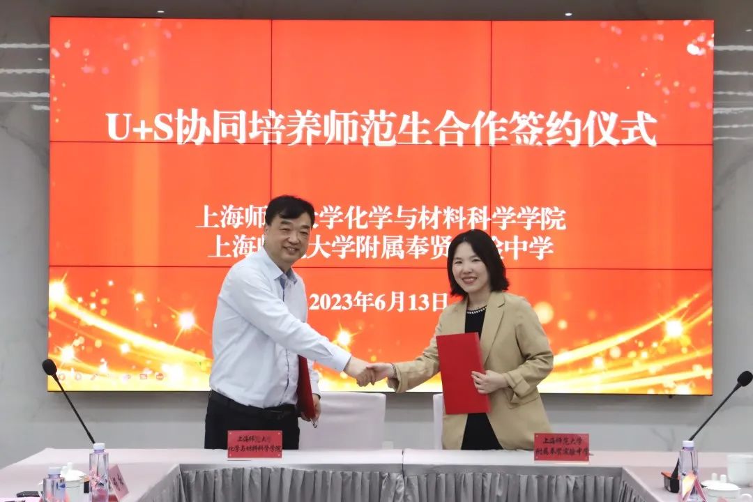 为进一步促进大学师范生的学习研究及未来发展,为附属学校的长远发展培育、储备优秀人才,2023年6月13日上午, 附属奉贤实验中学与 化学与材料科学学院举行“U+S”协同培养师范生合作签约仪式。