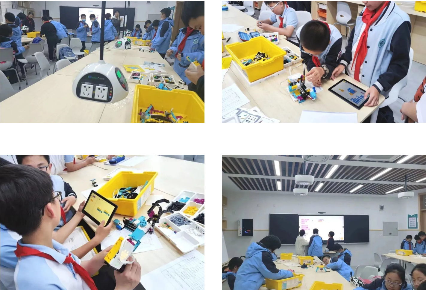 本学期,信机学院学生带领附属奉贤实验中学的同学一起学习了乐高机器人、AI编程进行积木接力赛、摘果器、计步器、瑜伽环等拼搭类系列课程。课程通过指导学生乐高拼搭编程的学习,提升学生“创造、自信、沟通、合作”的“4C”科创素养。