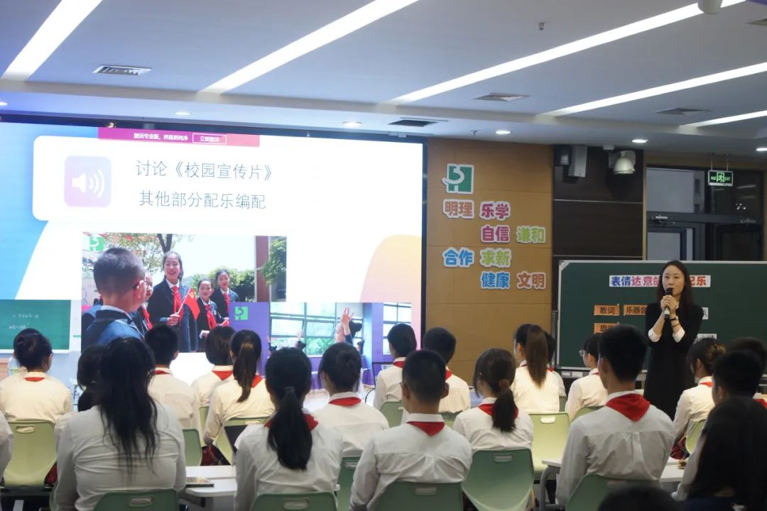 掌握了配乐的方法后,学生们开始小组合作,在IPAD上运用“剪映”软件中的音响素材分别为《建党伟业》、《中国医生》和《哪吒之魔童降世》三个电影片段配乐。最后,他们通过“希沃白板”中的投屏功能现场展示了创编成果。这些充满创意的配乐赢得了在场师生的阵阵掌声,所有人都为他们的才华和热情所感染。