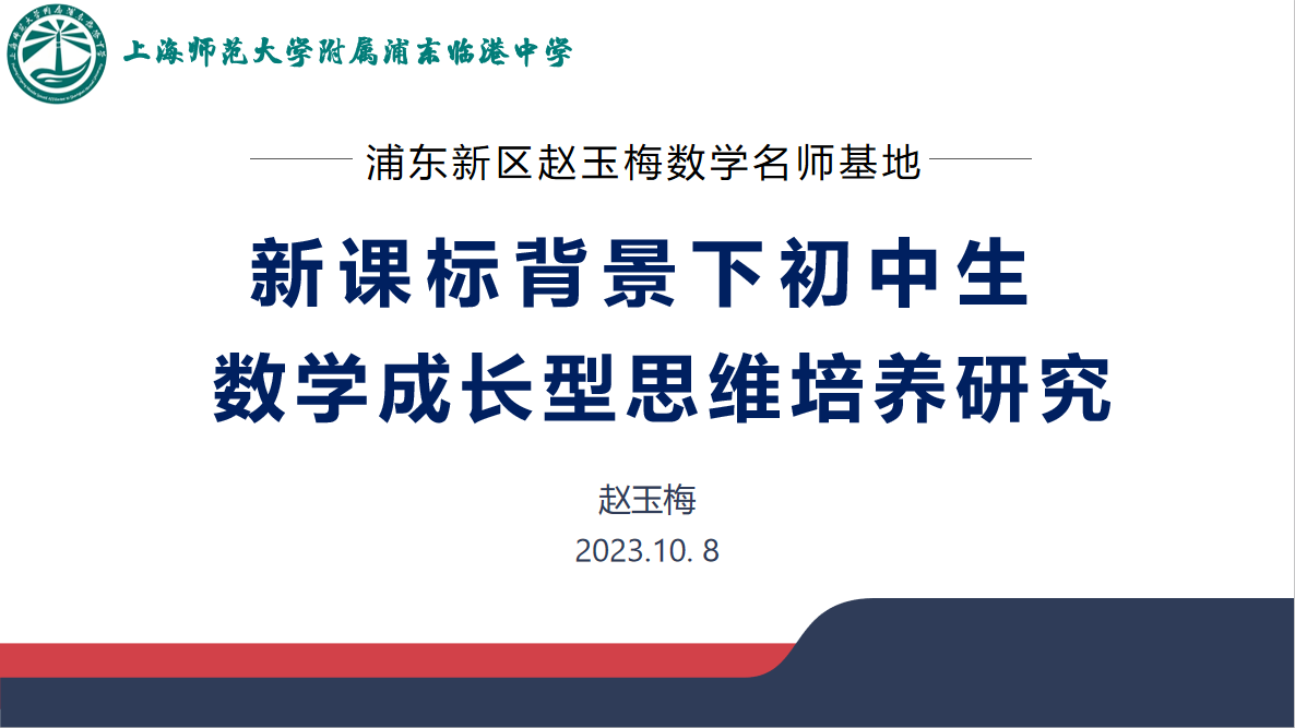 2023年10月8日,上海市浦东新区赵玉梅数学名师基地开班仪式暨首次活动在 附属浦东临港中学隆重举行。基地主持人、上海市特级教师、正高级教师、 附属浦东临港中学校长赵玉梅主持活动,来自浦东新区14所学校的20名基地学员与基地秘书共同参与本次活动。