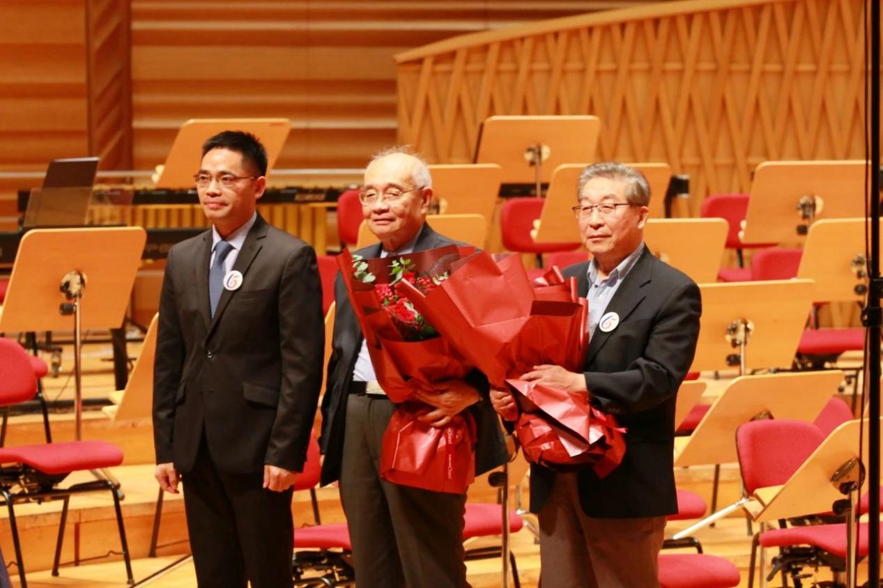 上师大附中管乐团经过23年的栉风沐雨,不断发展壮大,成为学校艺术教育的一张闪亮名片。这离不开附中一代又一代人的开拓进取和辛勤耕耘。黄岳辉向潘光博、张正之两位老校长献上鲜花,表达感恩和祝福。