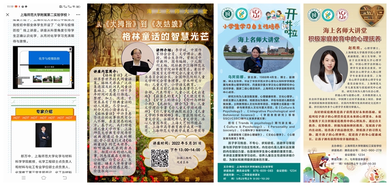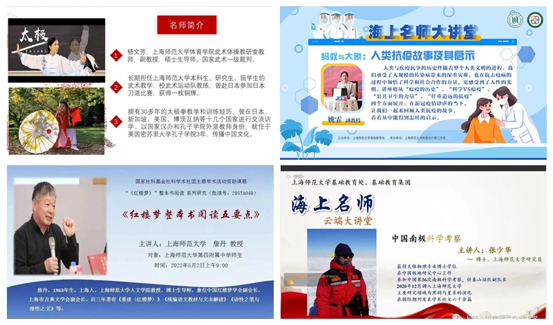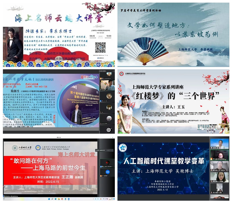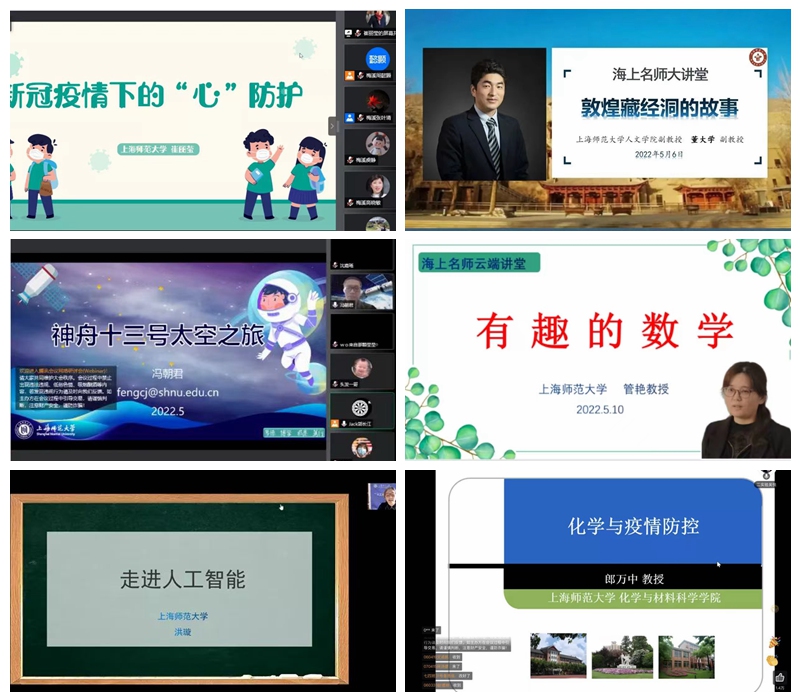 作为我校服务集团附属学校的品牌项目,这一季的“海上名师大讲堂”由于疫情搬上了“云端”,两个多月以来共举办了30余场专题讲座,从小学到高中,这季线上讲座受众范围广,惠及上万名附校学子,众多老师、家长也从中受益。为了保证首次“线上季”活动的顺利进行, 做了大量的准备,充分调研,提前调试,在时间、平台、方式上尽量满足各个学校的个性化需求。而在讲座内容方面,每场讲座的主讲教授都精心准备:在讲座策划的方向选择上,结合“双减”背景下,从文学、艺术,到科技、航天等,涉及方方面面;在具体讲授内容设计上,也颇花心思,为中小学生度身定制适合其年龄层次的方式,生动有趣、深入浅出。30余场“云端”系列讲座,场场精彩,亮点频现。
