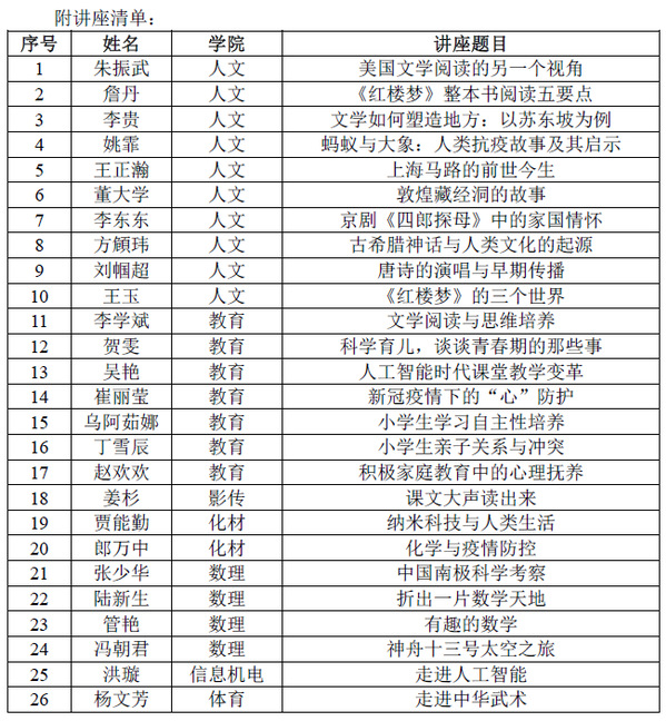 以文学为主题的系列讲座中,教授们走近中学生,带领同学们阅读中外经典;以科学为主题的系列讲座中,从身边防疫,到纳米技术,从南极到太空,教授们重在培养孩子们的科学精神;以文化为主题的系列讲座中,教授们带着孩子们探源中华文明,让孩子们感知文化底蕴。