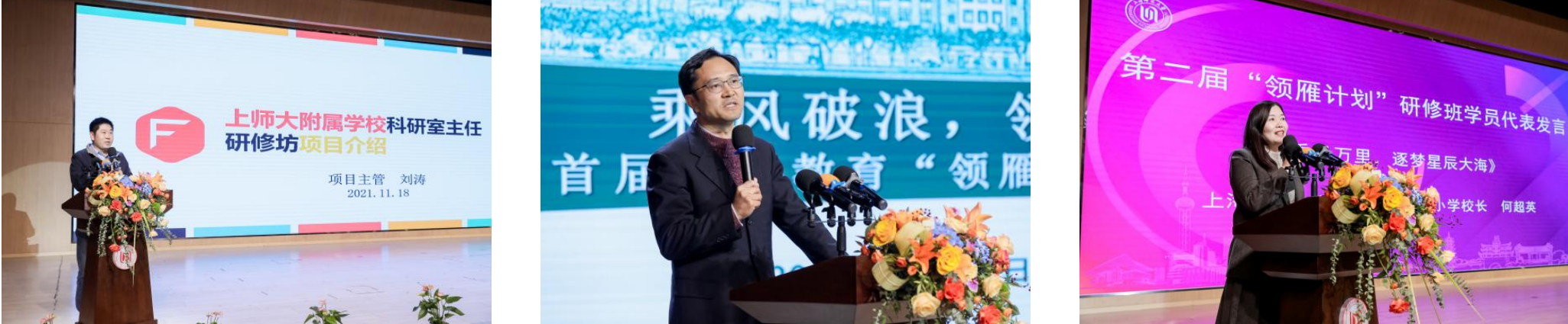 基教集团“科研室主任研修工作坊” 项目和第二届“领雁计划”研修班的开班典礼在年会上举行。科研室主任研修工作坊主管刘涛副教授为大家介绍了该项目的内涵、目的和实施计划。郭长江对第一期“领雁计划”研修班进行总结,研修班由师大相关学科副教授与五个新城优秀校长与教师混编研训,取得丰硕成果,其中参与首期领雁班的大学部26名学员中培育出挂实职区教育副局长1名、挂实职市重点高中副校长1名、挂实职区教育学院副院长1名、提任学院副院长1名、外派任附属学校校长5名、外派附属学校挂职副校长9名。第二期“领雁计划”研修班由大学部相关学科副教授、附属学校校级干部、中层正职等组成,将开展为期一年的基础教育管理能力提升研训,附属奉贤实验小学校长何超英作为第二届“领雁计划”研修班的学员代表,作题为《乘风万里,逐梦星辰大海》表态发言。