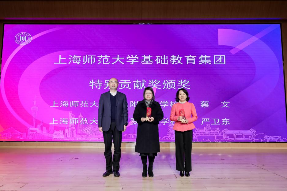 年会上举办了 基础教育集团特别贡献奖、第二届“上师杯”小学语文教师教学素养大赛教学素养一等奖和优秀组织奖的颁奖典礼。张峥嵘为2022年被上海市教委命名为“上海市特色高中”的 附属罗店中学和 第二附属中学颁发特别贡献奖。李晓芳等为 第一附属小学汪娜、附属卢湾实验小学陈晰圆、松江未来实验学校宋徐晓雯颁发语文教学素养大赛一等奖。王健等为附属第五嘉定实验学校、附属松江实验学校、松江未来实验学校、附属闵行第三小学南校、 第一附属小学、附属卢湾实验小学颁发优秀组织奖。