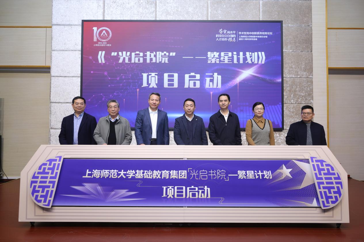 基础教育集团《“光启书院”——繁星计划》也在 附属中学闵行分校建校十周年之际正式启动。该项目基于国家战略和时代要求,由 牵头,选拔上海市实验学校、上师大附中及其闵行分校、宝山分校等 基础教育集团的核心示范性高中校的基础学科拔尖学生,进入大学校园开展冬令营、夏令营的书院式集训,紧紧围绕立德树人根本任务,利用师范大学文理见长的基础学科优势,深入推进基础学科拔尖人才培养,不断加强系统设计、拓展选拔视野、创新培养模式、强化支撑保障,具体将在院士、杰青为代表的一批优秀博士生导师的带领下,围绕基础学科、前沿科学开展“指向问题解决的多阶挑战性学习任务群”的学习和研究,将大学的拔尖创新人才培养理念和方式向高中延伸,形成长周期、全链条式的基础学科拔尖人才培养体系,让高等教育与高中育人模形成互补,整合育人力量,联动为国家培养人才。