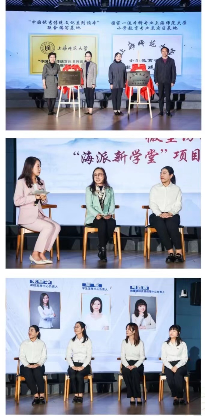 活动现场,上海师大专家与梅溪教师还围绕“海派新学堂”项目的实践进行了经验分享。为了进一步推进项目深化,“中国优秀传统文化系列读本”联合编写基地和国家一流本科专业上海师大小学教育专业见实习基地也将落户附属黄浦梅溪小学,杨燕、朱昊冰、郭长江和魏薇共同揭牌。