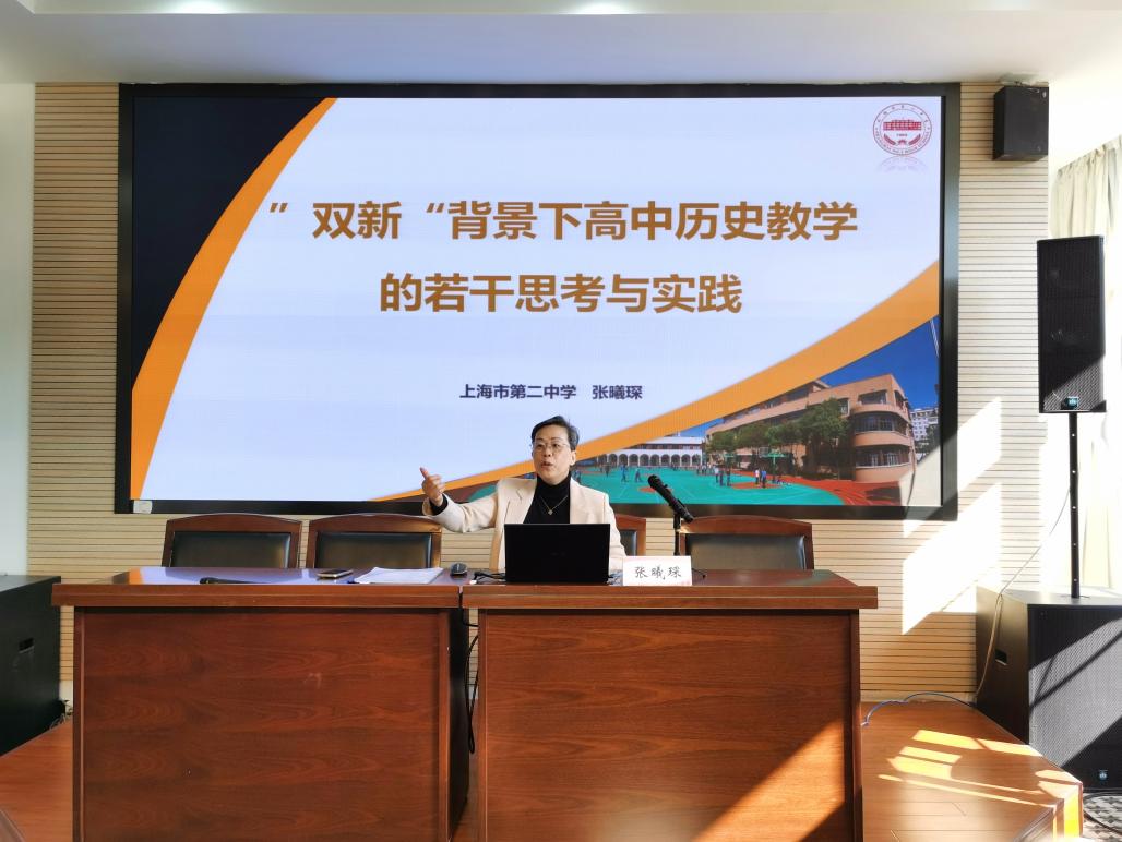 下午,上海市第二中学副校长、特级教师张曦琛作了《“双新”背景下高中历史教学的若干思考与实践》的报告,她聚焦“双新”实施以来教学中遇到的关键问题,从“理念到行为的转化”“因‘材’制宜而定教”、“素养培育关注过程”三个方面,分享了市二中学历史教研组的教学探索成果与思考。