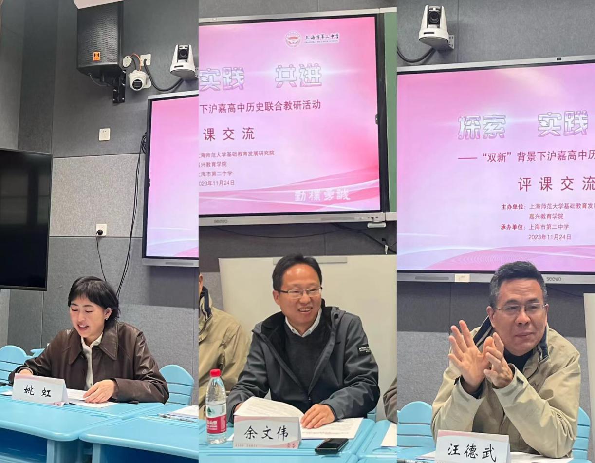 冬日凝霜不觉寒,同心共研暖归处。2023年11月24日,由 基础教育发展研究院牵头,嘉兴市余文伟“特级教师工作室”与上海市第二中学历史教研组共同举办了主题为“探索·实践·共进”的沪嘉高中历史联合教研活动。 副处长郭长江、 基础教育发展研究院办公室主任周燕菊、研训员王巍博士、 人文学院历史系王正瀚副教授参加了本次活动。