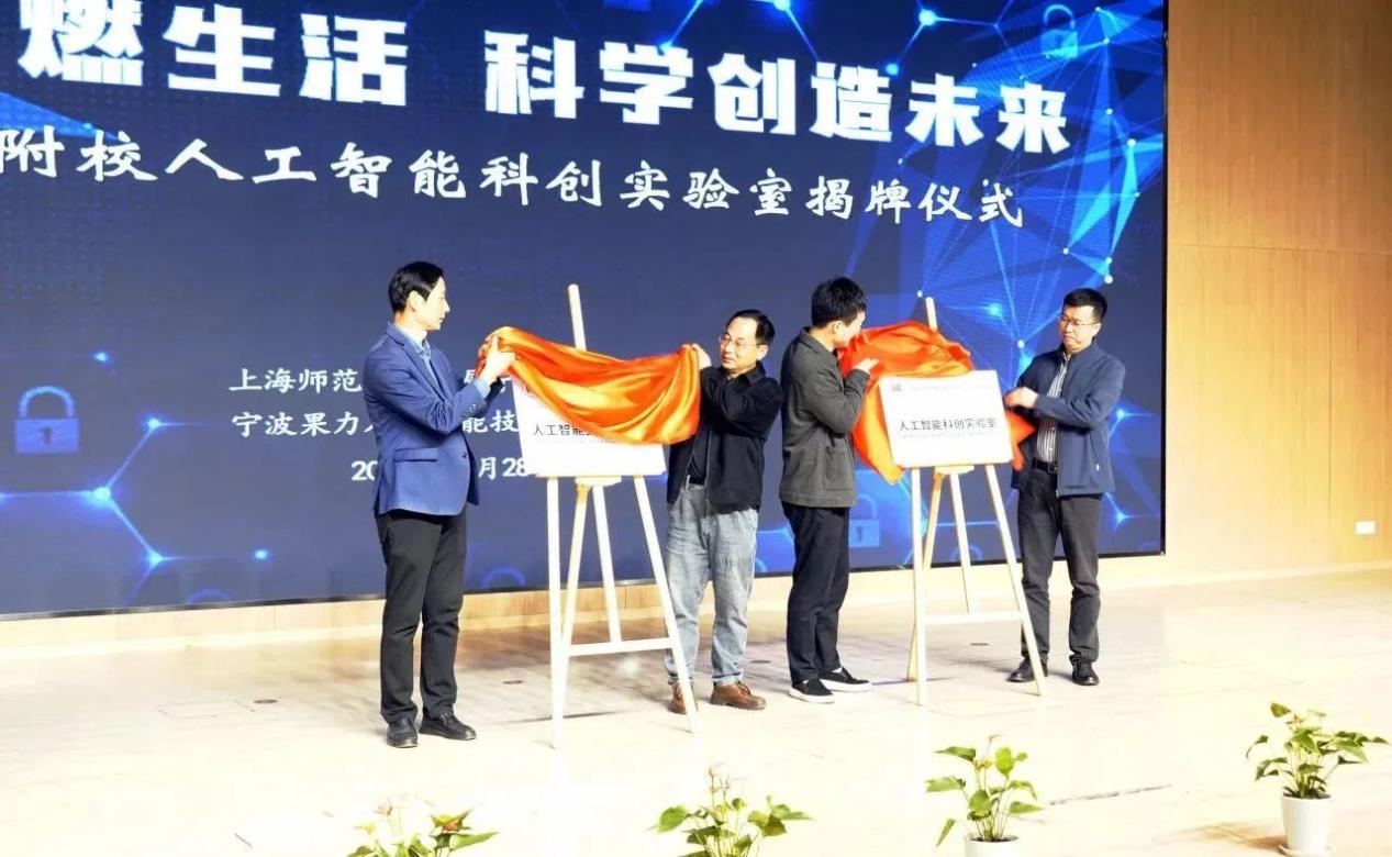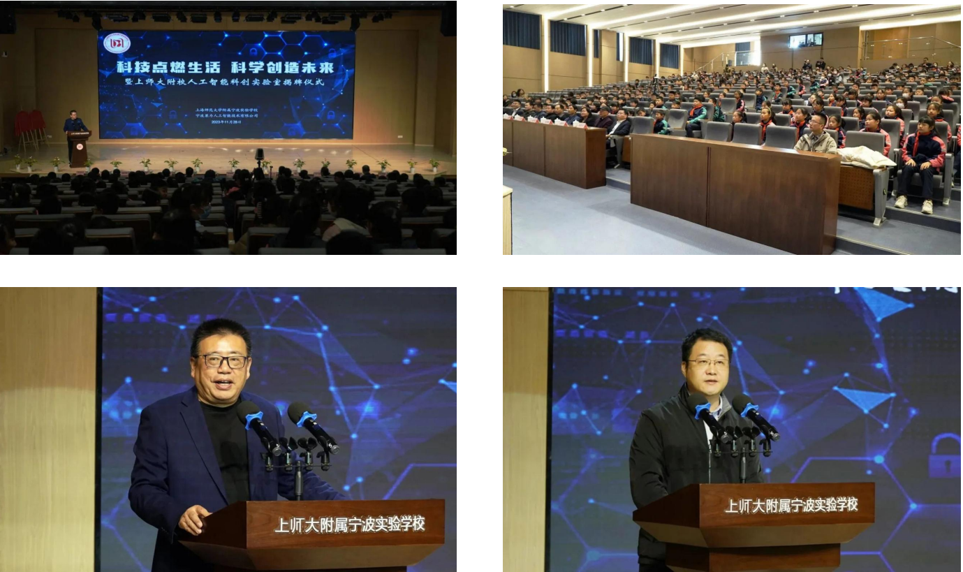 2023年11月28日上午, 附属宁波实验学校举行了主题为“科技点燃生活 科学创造未来”的人工智能科创实验室揭牌仪式。宁波市教育局装备中心主任俞奇峰、方桥街道党工委书记毛海涛、奉化团区委书记张钦皓、奉化区科协主席王亦建、奉化区教育局领导李永强、方桥街道副主任周黎、奉化科协秘书长徐亚莲、宁波生命科学城金茂副总经理丁晶、方桥街道教办主任董建平等参加揭牌仪式。揭牌仪式由附属宁波实验学校校长胡培华主持。