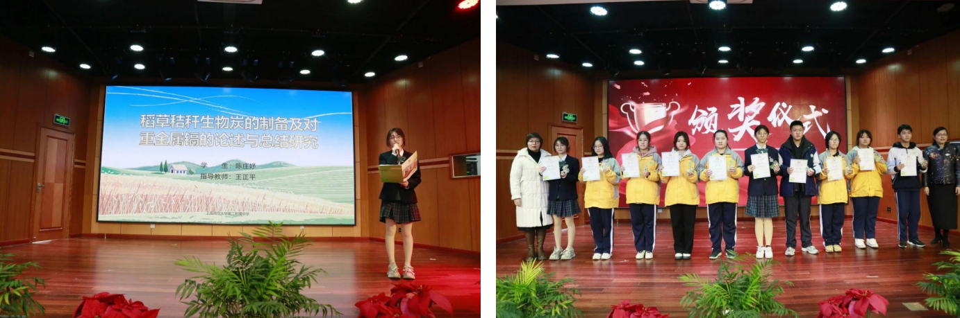 水质探索家活动中, 第二附属中学陈庄妤同学,介绍了自己关于稻草秸秆生物炭的制备和重金属镉的研究,在介绍中能够感受到她对水生态保护的关注和探索,通过她认真严谨的科研精神和规范系统的研究流程,可以一览二附中生态科技教育之树已然冒芽生叶。 副处长李晓芳、 第二附属中学校长蔡文为获奖同学颁奖。