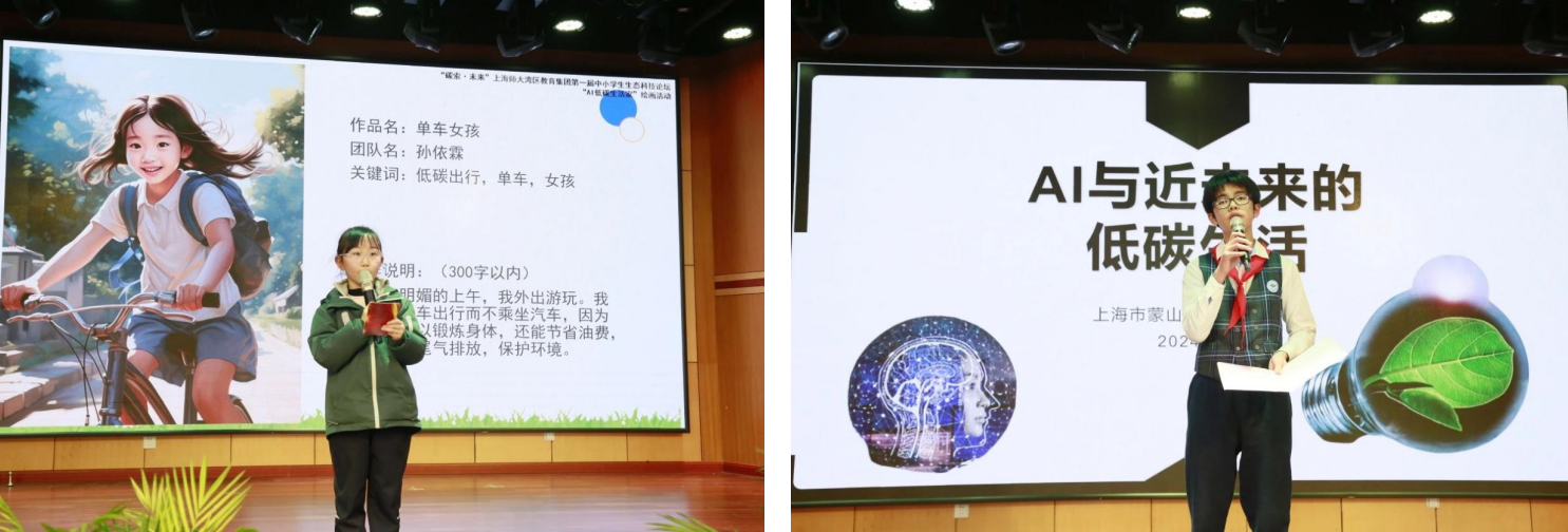 AI低碳生活家绘画活动中, 附属金山龙航小学孙依霖同学和上海市蒙山中学武志宇同学对自己用AI创作的作品进行了介绍,展现出不同年龄段对低碳生活的认识与看法。 附属金山龙航小学校长沈兰蓉、上海自然博物馆展教中心教育研发部部长刘楠、上海市育思青少年计算机科学发展中心理事长顾诗尧为获奖同学颁奖。