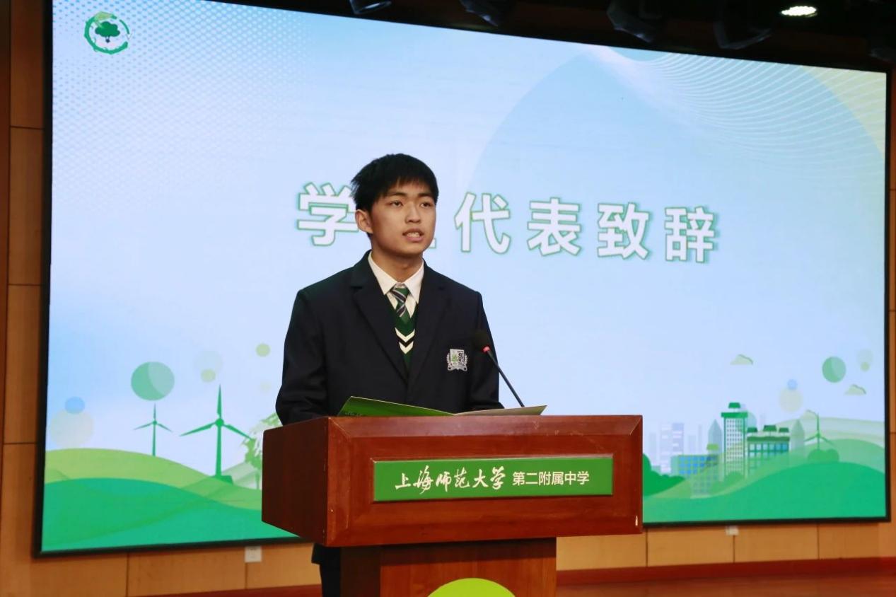 第二附属中学高一实验班唐浩真同学作为学生代表,为本次论坛致辞。他表示在本次的“碳索·未来”系列活动中,学生们提升了交流能力、探究能力、创新能力,收获了深刻的思考与启发,并呼吁大家携手合作,为绿色持续的未来做出改变,贡献自己的一份力量。