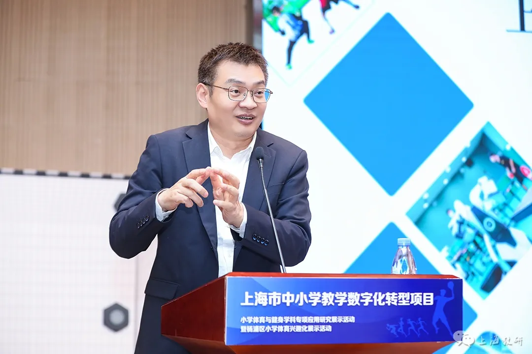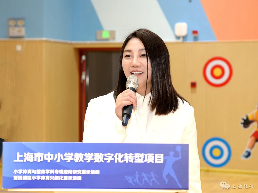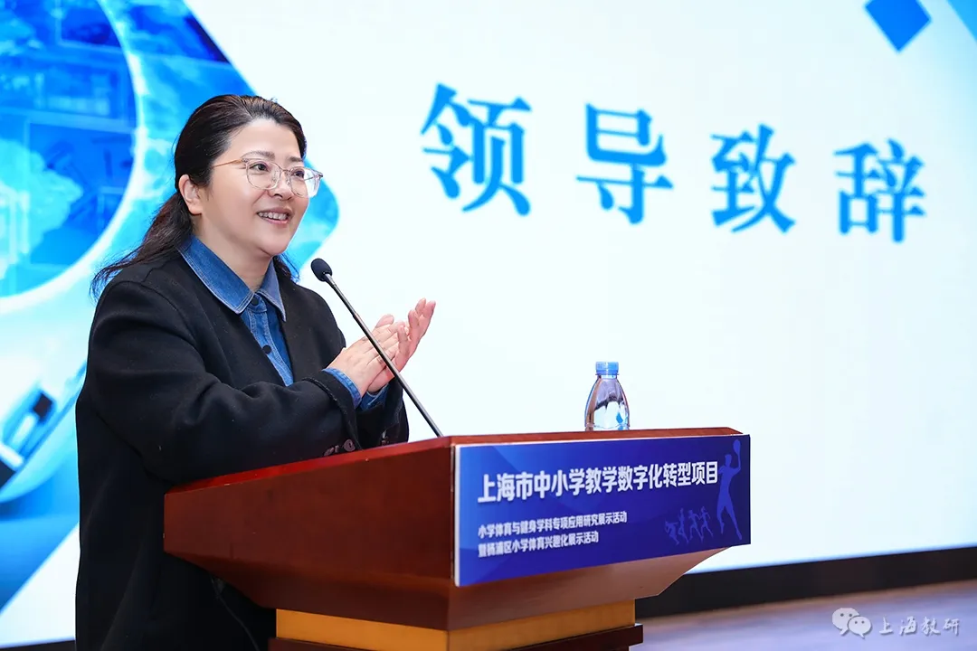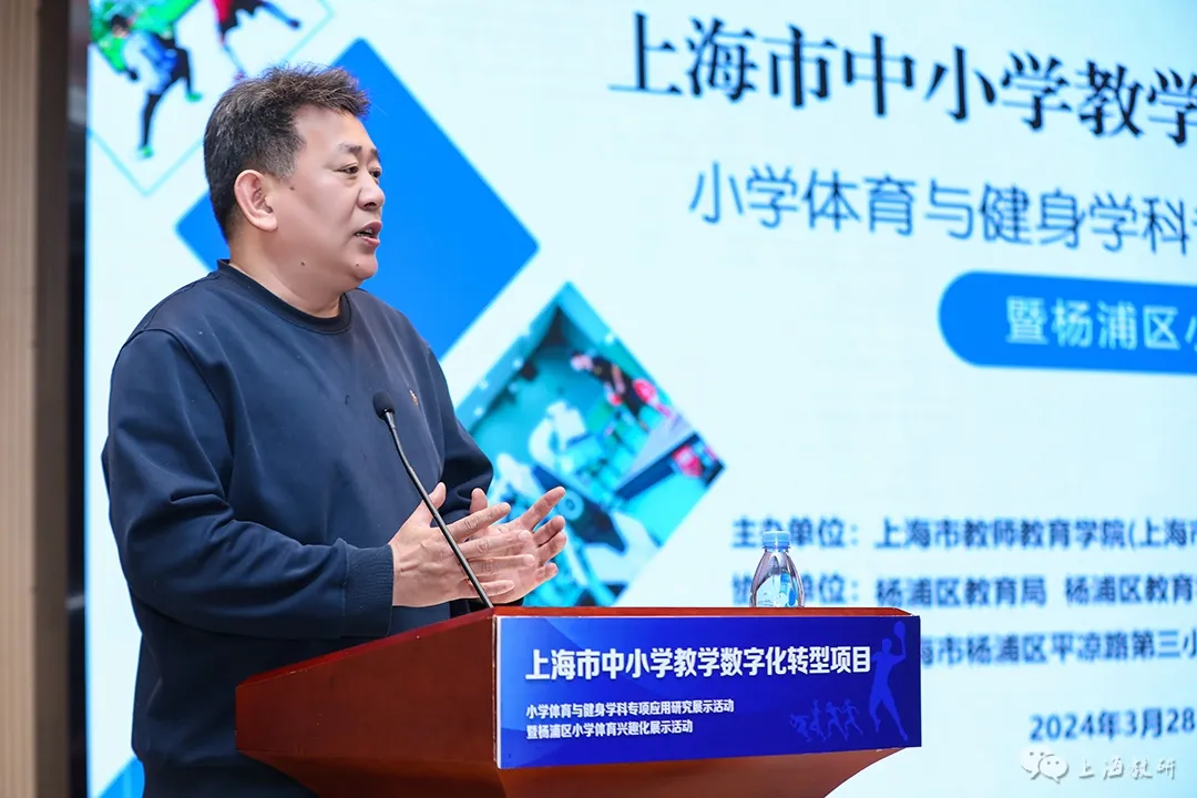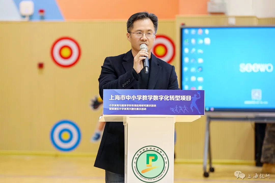 张鹰在致辞中指出,当前教学变革风起云涌,数字教学正成为赋能教育的重要力量。在上海市教委和上海市教师教育学院(上海市教委教研室)的引领和指导下,杨浦教育积极投身于数字化转型的伟大实践,大力推动以“智脑、智学、智联、智治”为核心的“四智行动”,致力于将创智教育的核心理念落到实处。杨浦教育聚焦新型教育设施建设,构建教育大脑,夯实数据基础;聚焦资源建设,打造信息化标杆校,引领校园数字化教学转型;聚焦教师队伍建设,以平台为支撑,提升教师信息素养;聚焦学生发展,全面提升学生数字素养。今天的小学体育数字化转型展示,正是杨浦在体育教学领域探索数字化应用场景的生动实践,旨在实现学生体育素养与数字素养的共同提升。
