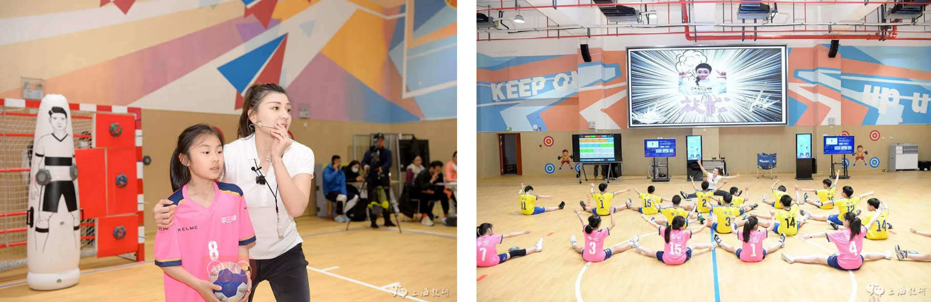 第二幕转向“教学助手”,上海市杨浦区控江二村小学王思范、上海市杨浦区回民小学张丽群、上海市杨浦区平凉路第三小学王之展和陈戈等几位教师,结合手球课堂,详细阐述了光电球、运动手环和希沃大屏等教学助手的运用,并分享了杨浦区在“三个助手”项目推动下的探索成果。
