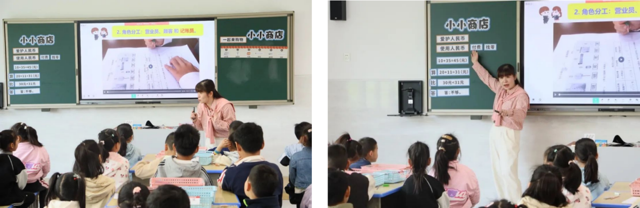 附属昆山良渚实验学校蔡永洁老师和附属黄浦梅溪小学唐立华老师执教同一课——《小小商店》。两位老师将购物情境引入到课堂教学,在真实的购物中让学生意识到数学和生活实际的联系。