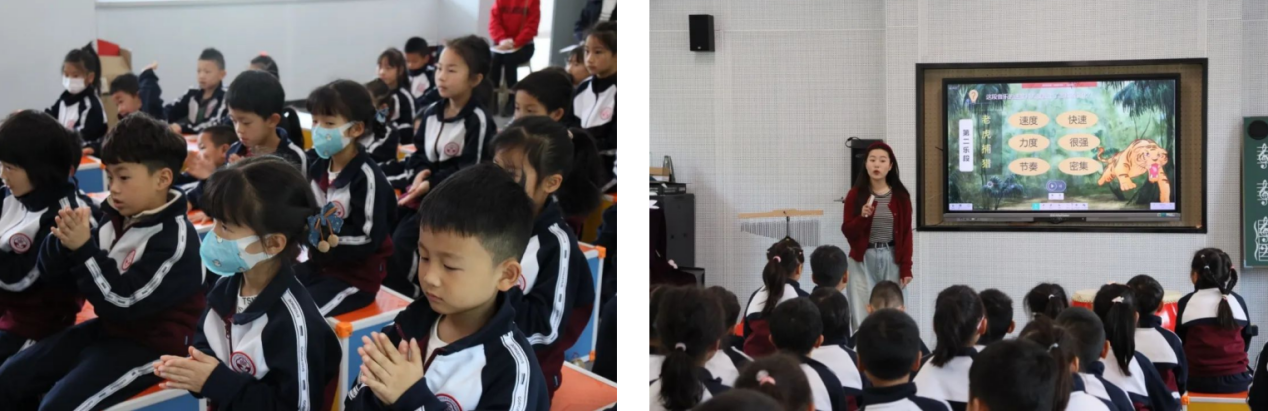 附属昆山良渚实验学校赵妍老师执教《老虎磨牙》一课,通过听音乐、看图形谱表现音乐的方式,清晰地呈现乐曲的力度、速度、节奏和音乐形象的变化。同时赵老师充分利用课件、图片等手段创设了各种学习情景,让学生在轻松愉快的氛围中学习。