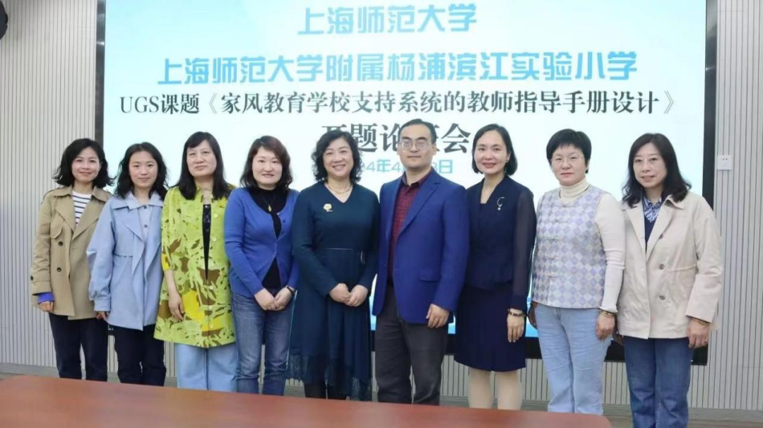 2024年4月28日, 附属杨浦滨江实验小学召开了UGS课题《家风教育学校支持系统的教师指导手册设计》开题论证会。本次论证会邀请了 教育学院副院长阎亚军,原杨浦区教育学院德育室主任、特级教师、正高级教师戴耀红,平凉路第三小学德育主任、正高级教师沈丽瑾作为论证专家参与指导。 挂职副处长吴一萍,附属杨浦滨江实验小学党支部书记、校长郑小燕出席本次活动,课题主持人 马克思主义学院副教授杨茜茜,以及 马克思主义学院、附属杨浦滨江实验小学、上海市家庭教育指导名师工作室郑小燕工作室等课题组成员参加活动。