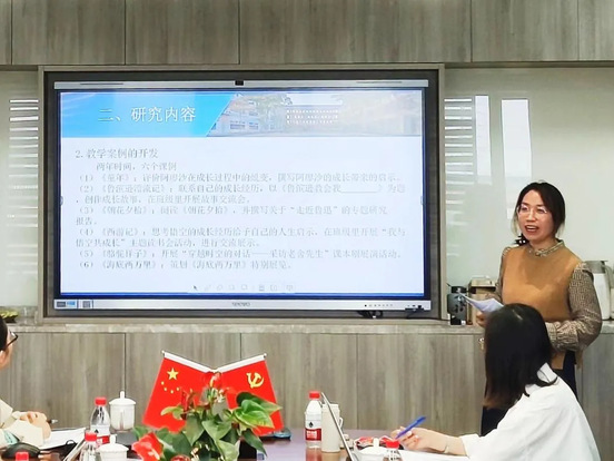 附属青浦实验中学宁英娟老师做题为《“学习任务群”理念下的初中语文整本书阅读教学案例研究》的课题展示,讲述了该课题的相关研究基础和研究目标,并以教学中的阅读任务群为例,生动介绍了教学案例的开发、教学策略的提炼等研究内容以及该课题拟解决的问题和预期成果形式。
