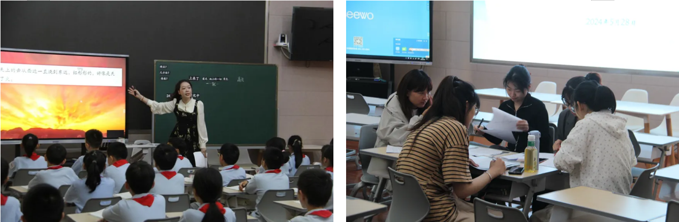 5月28日, 基础教育集团小学语文教师共同体2023学年第二学期第三次研修活动在 第一附属小学西校区举行。本次活动围绕“读写贯通,凸显要素习方法”这一主题开展,上海市教师教育学院小学语文教研员、特级教师薛峰、陈祳,研修班班主任、虹口区教育学院特级教师、正高级教师袁晓东,普陀区教育学院小学语文教研员、正高级教师颜欣玮,徐汇区教育学院小学语文教研员闵晓立以及种子团队的老师参加了本次研修活动。