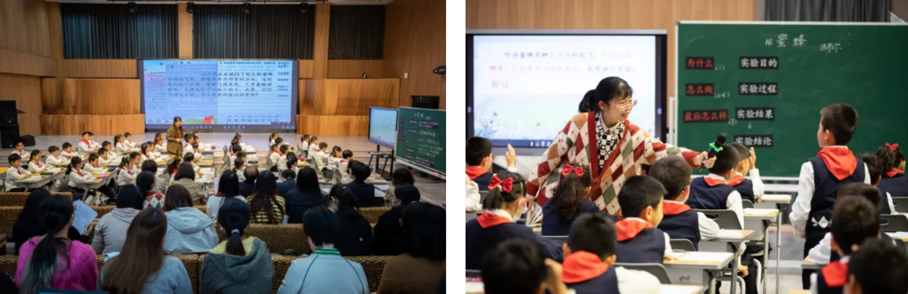 4月22日,研修班本学期第二次研修活动在 附属闵行第三小学举行。 康城实验学校张璐芸和 附属闵行第三小学张婉莹分别执教了三年级下册第四单元《蜜蜂》的第一和第二课时。两位老师紧扣“读写贯通”的教学思路,通过抓关键词,梳理文本主要信息,概括实验目的、过程和结论,培养学生的概括能力,落实单元语文要素。随后,各小组学员代表交流了听课心得,肯定执教教师精心设计的同时,提出问题、分享观点,共同探索教学设计和教学效果的优化路径。