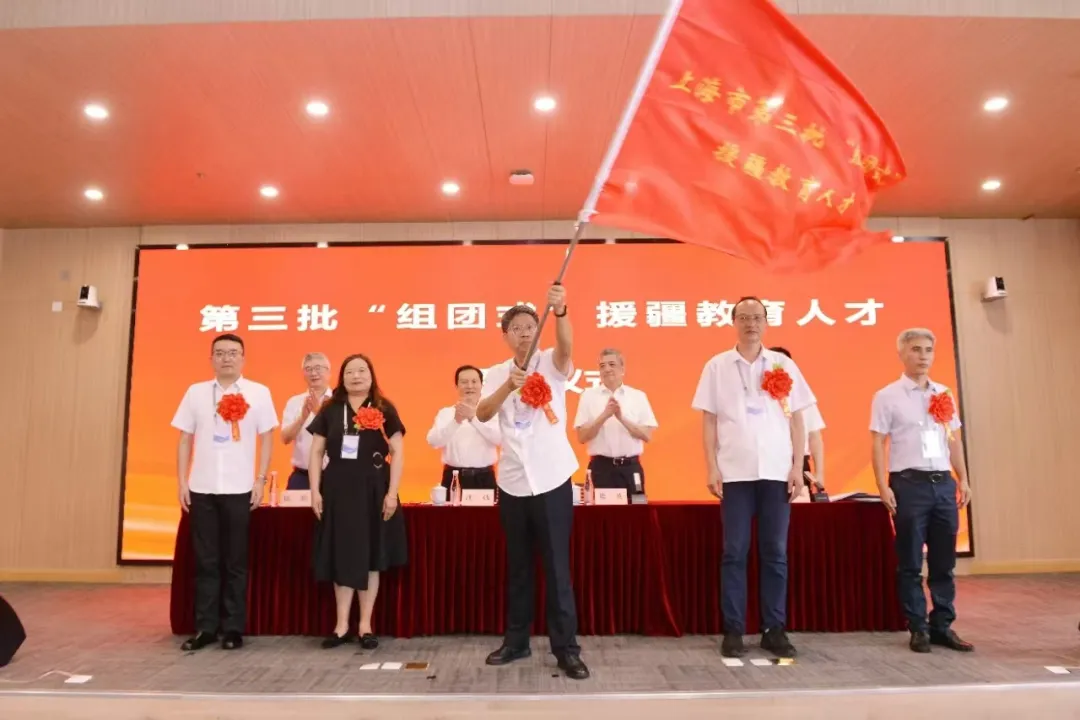 当天上午,上海市第二批“组团式”援疆教育人才工作总结会暨第三批“组团式”援疆教育人才行前动员会在联合国教科文组织教师教育中心世承讲堂顺利召开。市教卫工作党委、市教委、市政府合作交流办领导为为第二批“组团式”援疆教育人才代表颁发荣誉证书,为第三批“组团式”援疆教育人才代表佩戴大红花并授旗。