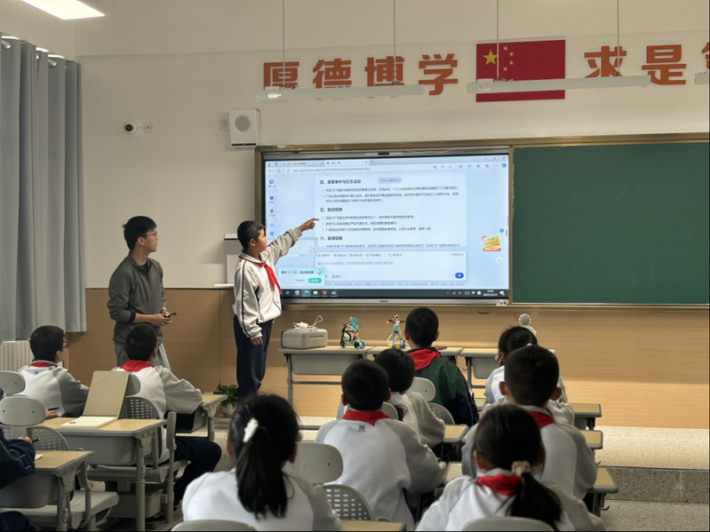 在《绘制红色图鉴,对话AI导览》课程现场, 孙逸晨、杨晨两位老师以人工智能技术为载体,通过“云参观”的方式,引导学生了解中国共产党第一次全国代表大会会址的历史故事,激发学生对红色文化的兴趣和爱国热情。