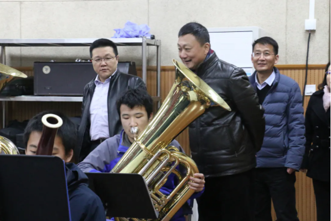 林在勇、孟庆源一行参观了学校民俗美育教育基地、四美展区、艺体中心等地。在排练厅,大家听取孩子们正在练习的肖斯塔科维奇《第二圆舞曲》和詹姆斯•伯恩斯《节奏》后,赞赏有加。兴之所至,欣然留言:科学人文并重 艺术美育为长;守正创新 美出特色。