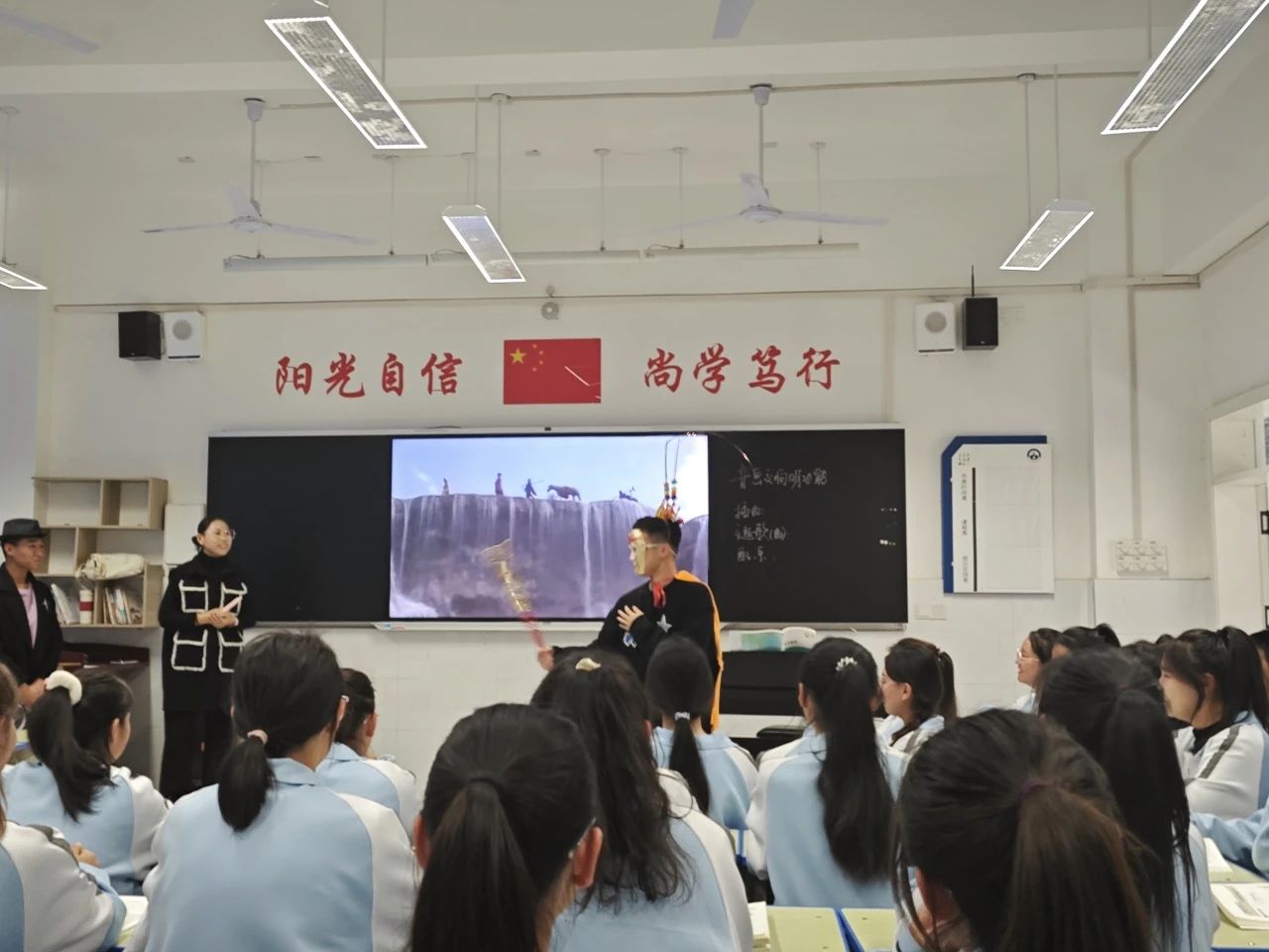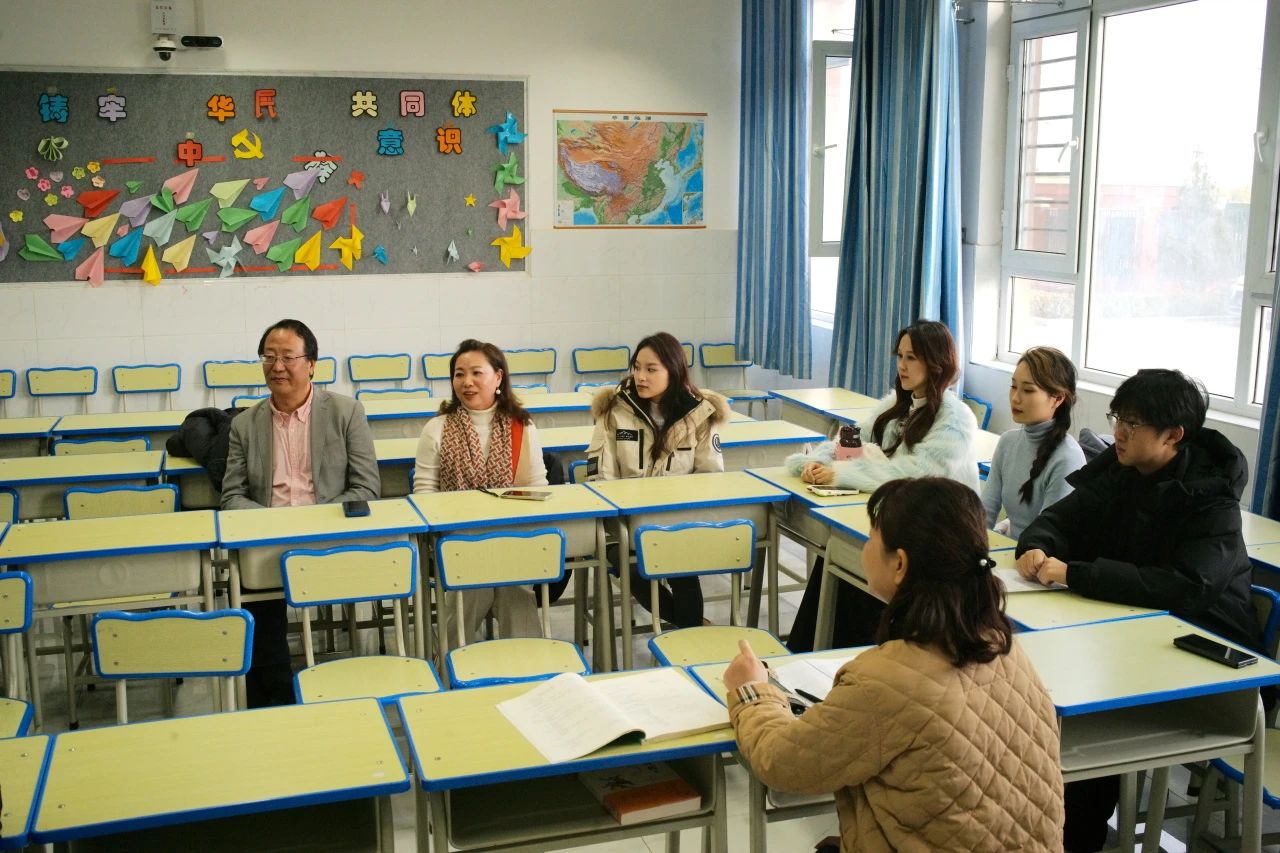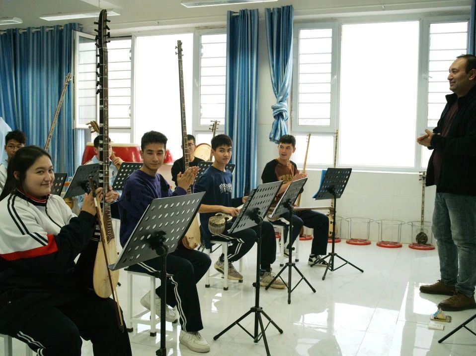 在接下来的活动中, 音乐学院师生代表与附属喀什实验中学师生开展了深入的交流指导活动。附属喀什实验中学的王灿然老师执教《中国影视音乐》公开课,通过情景模拟、音乐鉴赏等方式,引导学生领略经典影视音乐的独特魅力。课后,在附属喀什实验中学音美学科组组长姑丽米热・塔西老师的精心组织下,双方围绕音乐教育理念与方法展开评课交流研讨。 师生对王老师的公开课给予高度评价,并分享了专业见解,为附属喀什实验中学音乐教育发展提供了有益指导。