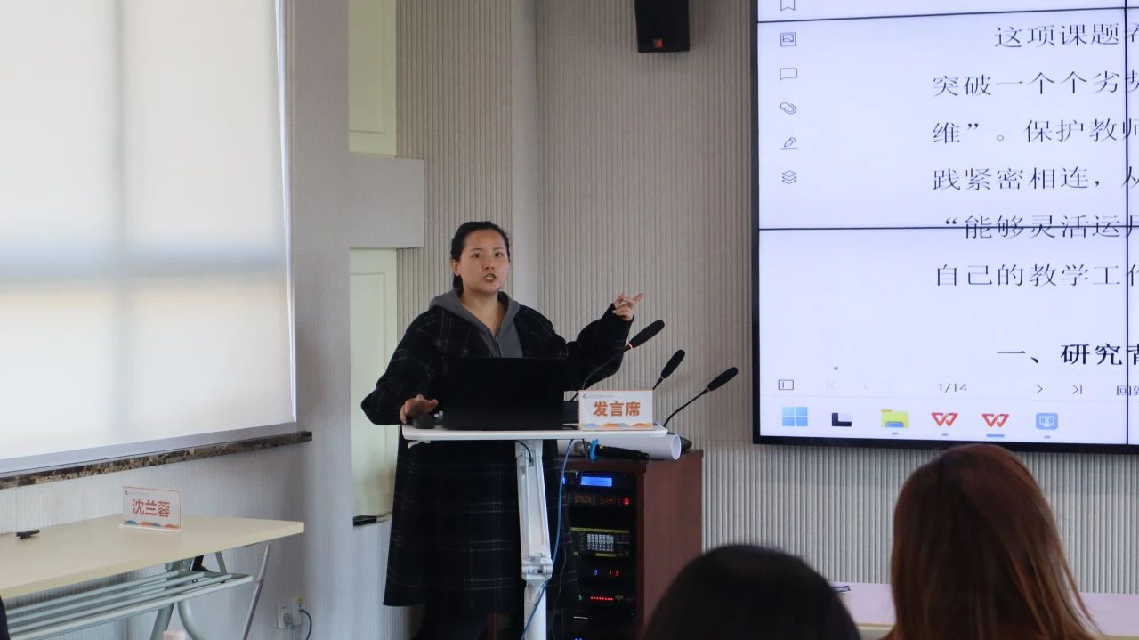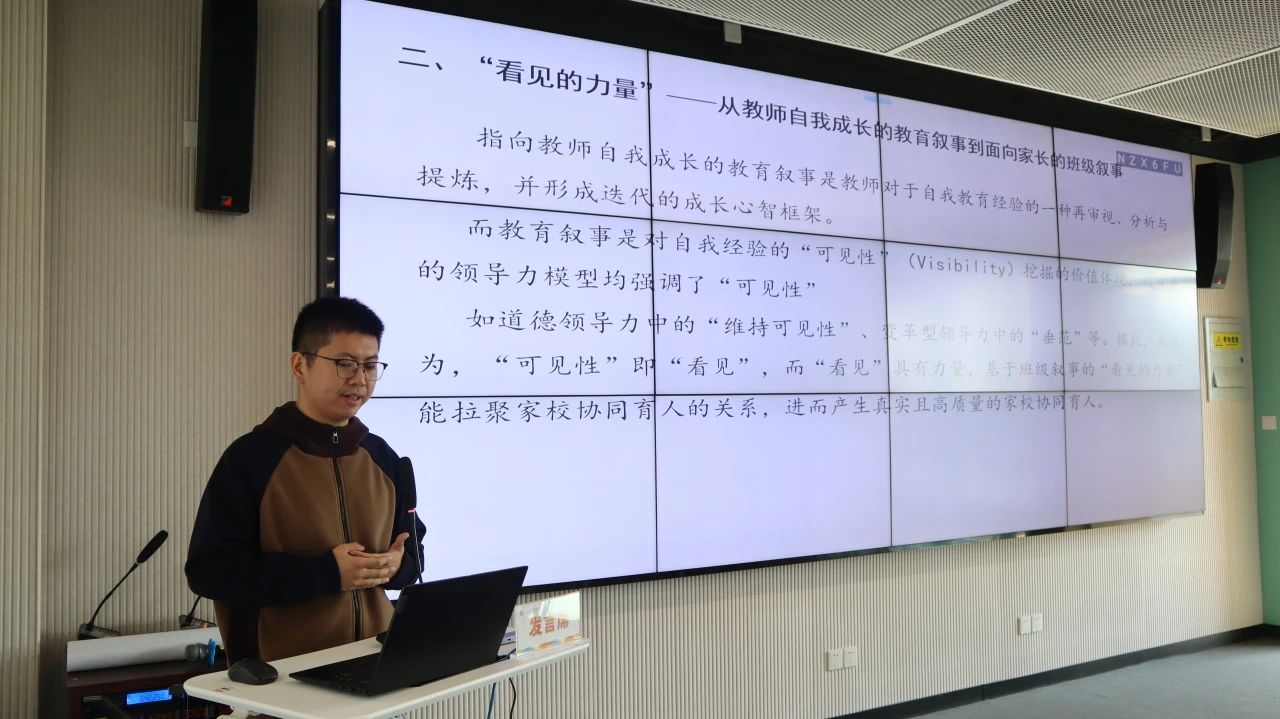附属金山龙航小学金辉召老师以《看见·融合·行动:以班级叙事为载体的家校协同育人的行动研究》为题,深入分享了其研究成果与思考。他从行动研究的缘起切入,系统阐释了从教育叙事到班级叙事的转变过程,探讨了叙事与阅读互动的实践路径,并对行动研究本身进行了深刻反思。同时,金老师提出了将叙事方法广泛应用于教师专业发展活动的设想,为教师发展与家校协同育人提供了新的视角和实践启示。