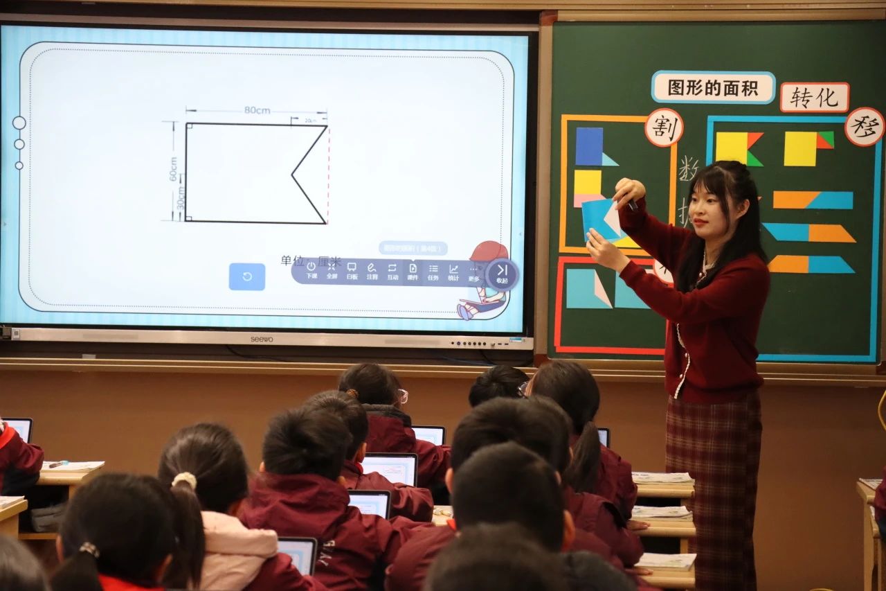 课堂教学观摩环节, 附属外国语小学蒋蓓蓓老师执教了五年级的“图形的面积”一课。她让学生在平板上操作练习,引导学生借助“AI三个助手学件”掌握“割、补、移”基本图形的方法,领悟“转化”的数学思想,培养学生解决数学实际问题的能力。 附属松江实验学校徐子涛老师带来一年级“进位加法”的教学片段。他借助实物摆放到小棒操作再到符号表征,引导学生在观察比较和抽象概括中逐步理解进位加法的算理,掌握“凑十法”,发展学生初步的运算能力。
