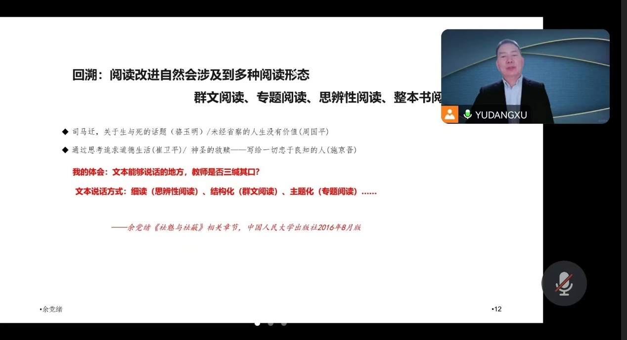 11月13日,余党绪老师为学员们作“我的教学探索和学术表达”微讲座。从思辨性阅读到整本书阅读,再到追求学理的文本解读与阅读教学,余老师以自己几十年的教学实践和研究探索为例,希望各位学员由启而发,笃行致远。