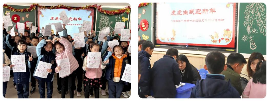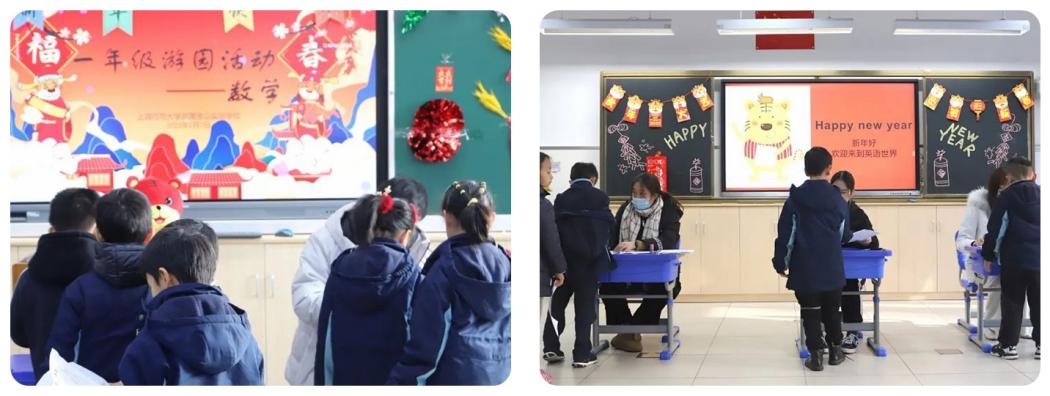 1月7日上午, 附属宝山实验学校全体一年级学生参加了语数英学科游园评价活动。以《小学低年段语数英学科基于课程标准评价指南》为指导,在有趣的情景中进行了语文“金虎送福”的选出正确读音、“如虎添翼”的词语认读、“虎虎生威”的朗读句子、“舌尖上的春节”说话练习四个闯关小游戏,充分激发了孩子们的闯关热情。数学学科则有“五虎临门”计算训练,“如虎添翼”、“威萌出道”是对数射线、比大小进行了复习,“虎年大吉”更是联系了孩子们的生活,对应用题进行了巩固。英语的”I can read”、”I can say”、“I can sing”三个环节既考查了学生一学期的学习,更调动了他们对知识需求的积极性。