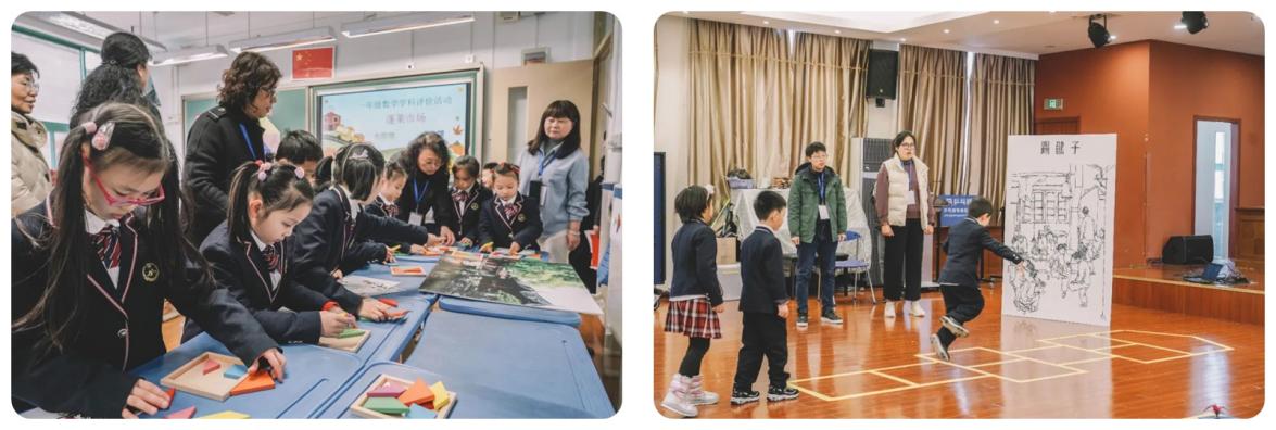 附属黄浦梅溪小学以“傲梅初开显灵动 和厚学子展梦想”为主题,举行了一年级绿色评价活动——“玩转老城厢”。他们采用了模拟情境的游戏方式,让道德与法治学科走进龙门村。语文学科则设计了“杂货小铺”和“环城电车”两个活动,目的是为了巩固一年级的语文重点——拼音。而走进“蓬莱市场”,看到了数学评价活动。生们排队拿上自己喜爱的小吃,到账台付费,算出一共需要花费的价钱,用有趣的形式对一年级上半学期计算部分进行测评,同时也让学生感受数学源于生活,用于生活。此外还有体育、美术、自然、音乐等学科的精彩活动。