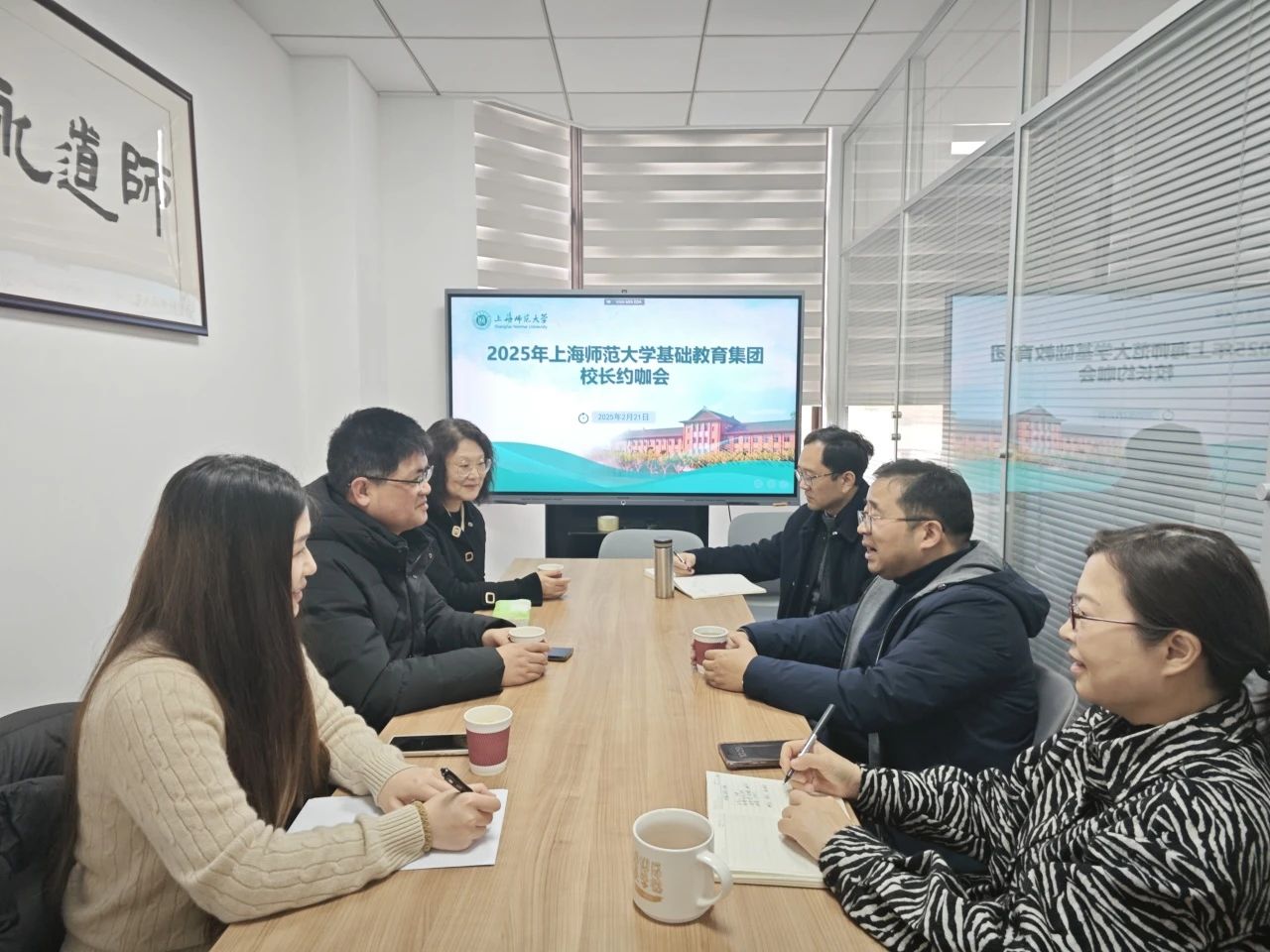 2月21日, 组织召开2025年 基础教育集团“二月校长约咖会”。 教务处处长、 处长王健, 副处长郭长江、李晓芳, 附属浦东临港小学校长王先云、副校长宁锋、校办鲍莉莎老师等出席活动。本次会议旨在总结办学经验,探讨未来发展路径,进一步推动基础教育集团校的高质量发展。