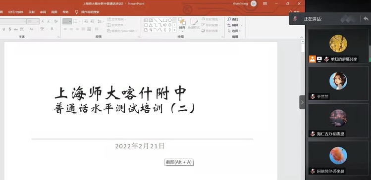 附属喀什中学,离上海5092公里,是离 本部最远的附属学校。但是,距离并未阻隔大学部与上师附喀的联系。从2022年2月14日开始,根据上师附喀的实际需求,在研究生院常务副院长陈昌来教授、人文学院院长查清华教授的支持下,人文学院单虹老师带领对外汉语学院六位研究生:姚舒淇、周文豪、吴优、武婷、魏文文、高明,量身定制课程:线上培训,教师授课+自学辅导,每天助教打卡督促、反馈,一周一次助教主持小组学习交流,包含31名少数民族教师的普通话培训班正式开班。