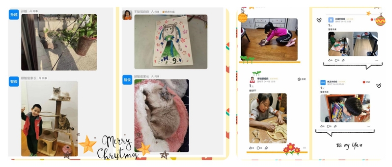 首先吴凯雯老师为学生们建立了“班级生活交流群”,为同学们搭建交流桥梁,让孩子们在群内分享自己的居家生活。群一建成,几乎所有的孩子第一时间和自己的好朋友联系起来,他们在群里分享了自己家的宠物,分享自己的绘画作品、折纸作品,有的带好朋友“云参观”自己的书房,有的带好朋友“云欣赏”阳台上的植物……一时间,群里好不热闹!