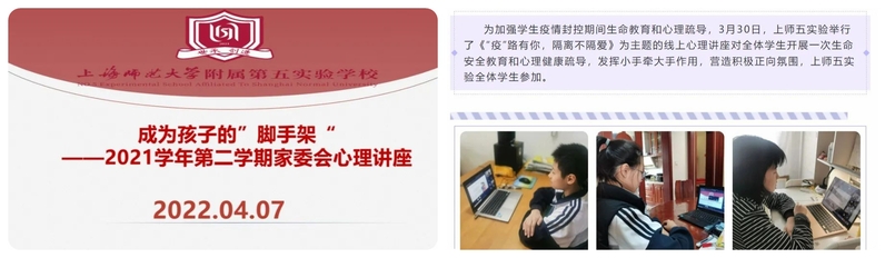 此外疫情期间,学校各班班主任尤其关注学生的心理健康,鼓励孩子积极参与学校推出的心理健康活动、专题讲座、亲子活动等。让孩子们得到更多专业的帮助。班会课全员参与,互动性强。近视预防、安全教育、科学防疫。在班会课上,孩子们畅所欲言,多了一份亲密,少了一份距离,有了一种在校与同学交流的感觉,让居家学习更有“味”。