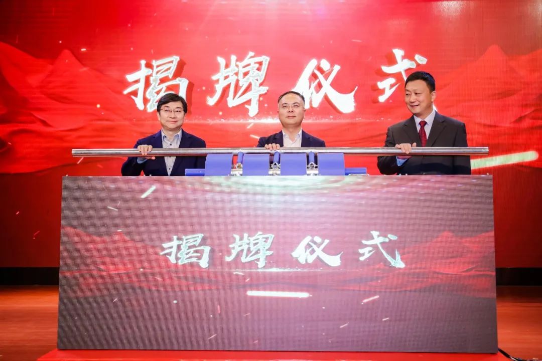 黄浦区委副书记、区长沈山州, 党委书记林在勇,上海市教委副主任杨振峰上台共同启动卷轴,为 附属黄浦梅溪小学揭牌。