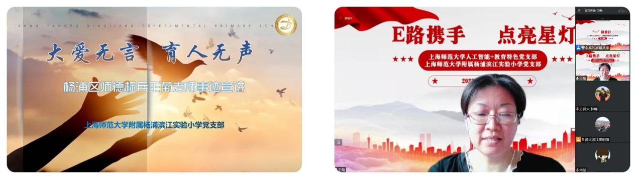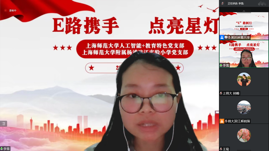正值 杨浦滨江实验小学一周年校庆来临之际,为推进立德树人,进一步发挥党员在疫情期间先锋模范作用,6月13日下午, 人工智能+教育特色党支部与杨浦滨江实验小学党支部全体成员齐聚云端,联合开展“E路携手,点亮星灯”主题党日活动。 信息与机电工程学院党委副书记、副院长何佳, 杨浦滨江实验小学党支部书记、校长郑小燕出席并讲话,双方党支部全体党员与入党积极分子参会,活动由人工智能+教育特色党支部成员徐立同志主持。