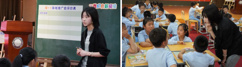 附属闵行日新实验学校杜弘老师与附属黄浦梅溪小学周芸佳老师同课异构《我们好好玩》。杜老师围绕传统游戏传承主题,课前组织学生采访祖辈,收集传统游戏故事,感受趣味;课中举办校园游戏日,组织学生体验踢毽子等游戏,体悟文化内涵;课后引导学生结合现代生活设计创新玩法,并设计方案,激发学生对传统游戏的探究热情与传承责任感。