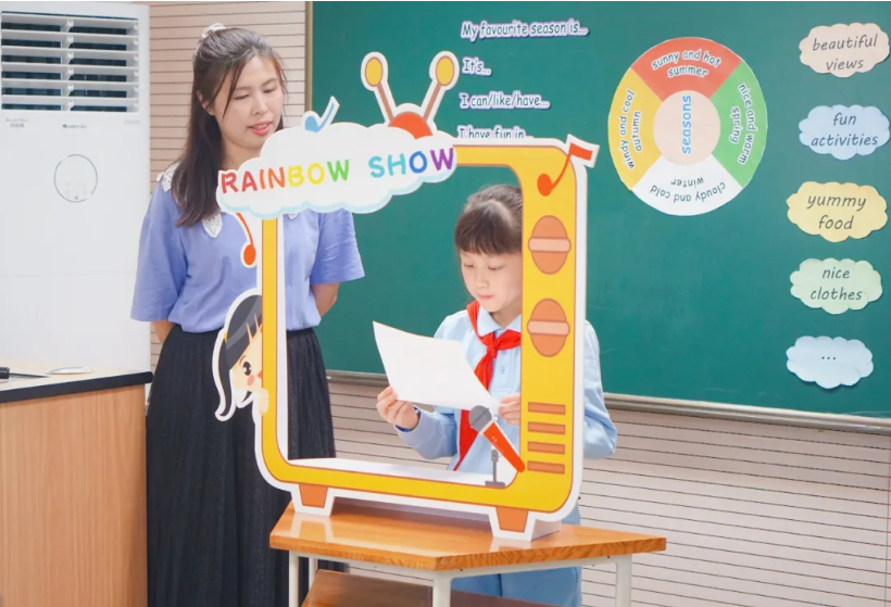 赵老师以“Rainbow Show”情境贯穿,学生通过模仿嘉宾Peter的语篇描述,结合本校研学周真实案例,激活表达欲,最终迁移至自主介绍喜爱的季节。教学中融入多媒体与道具增强趣味性,在真实情境中实现从输入到输出的递进,达成语言综合运用目标。