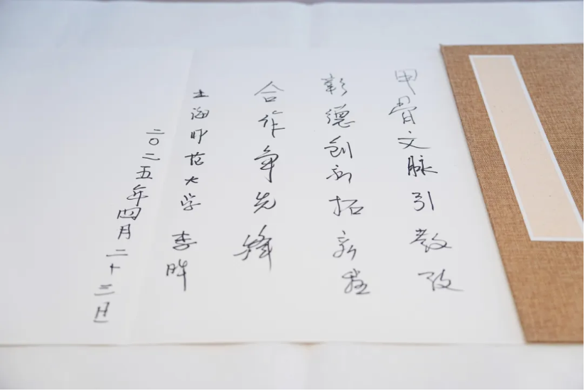 李晔对综合指导工作做了总结讲话。他对附属安阳中学先进的思想理念,清晰的目标规划,科学的实施路径、创新的教育实践和优异的办学成效给予充分肯定,对学校的大思政建设、跨学科整合和校家社协同育人实践给予指高度评价,认为附属安阳中学能够聚焦强国目标,顺应教育大势,对接基教高地、赋能优质发展,为基教集团成员校做出很好的示范。李晔还表达了加强双方合作交流的期望。他表示, 正致力于打造全球教师教育的高地,未来将为附属学校输送理论、课程和师资培养等多方面的资源,希望附属安阳中学在新领域积极探索,为基础教育发展做出更大贡献。会后,他寄语未来,欣然为附属安阳中学题词:甲骨文脉引教改,彰德创新拓新程,合作争先锋!