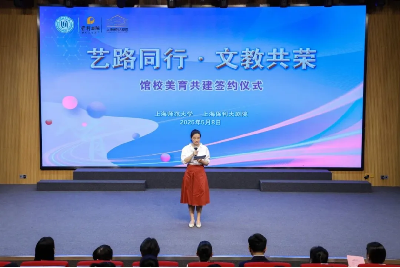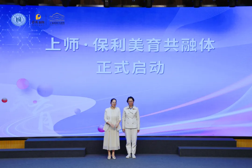 随着管文洁、何冬英共同推开大屏幕上的“艺术之门”,“上师·保利美育共融体”正式启航!动态光影中,象征文教共荣的画卷徐徐展开,优美的 校园和时尚的上海保利大剧院场馆同框出镜,寓意崭新的馆校合作将点亮学生的艺术梦想。
