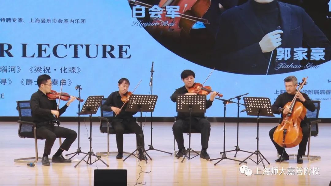 弦乐四重奏是室内乐的核心,也是认识古典音乐的最好方式之一。本次开营仪式最令人期待的就是“讲演式音乐会”环节,上海工会职工交响乐团团长、常任指挥,上海音乐学院管弦乐系提琴艺术硕士郭家豪携白会军、何圣凯、傅喻三位上海音乐学院优秀学生,用“边演边教”的形式,带来了一场精彩的弦乐四重奏表演。在演奏《蓝色多瑙河》、《梁祝·化蝶》、《千与千寻》、《爵士拨奏曲》等经典乐曲的同时,通过生动有趣的讲解、互动方式为音乐学子们带来了一场“沉浸式”学习与欣赏的珍贵体验,也在这个炎热的夏末秋初,为所有人带来了一份治愈的享受。