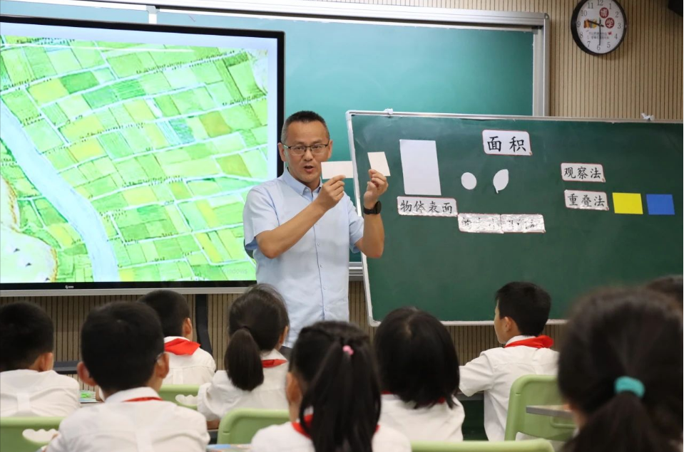 上海师大附属浦东临港科创小学李忠华老师执教了二年级的“认识面积”一课。他从生活情境引入,引导学生通过触摸、表述感知物理表现,引入“面积”概念,并引导学生用观察法、重叠法、测量法、数方格法等方法比较图形面积,强调统一面积度量标准的重要性,并运用创意活动强化学生对面积的认知,从而培养学生的空间观念与数学思维。