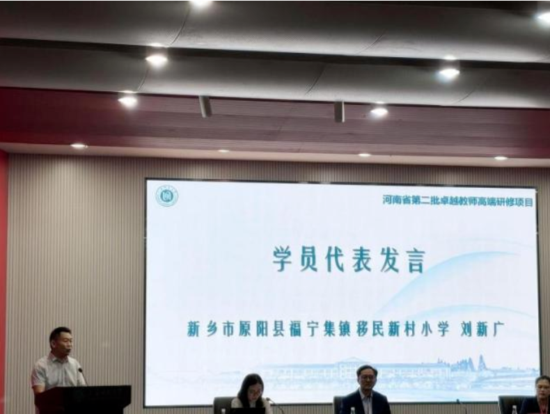 新乡市原阳县福宁集镇移民新村小学乡村首席教师刘新广作为学员代表发言,表示将珍惜此次学习机会,将所思所学内化于心、外化于行,以首席教师的个人成长,带动乡村教师的整体发展,守正创新、真抓实干、奋勇争先,为乡村教育“扩优提质”贡献力量。
