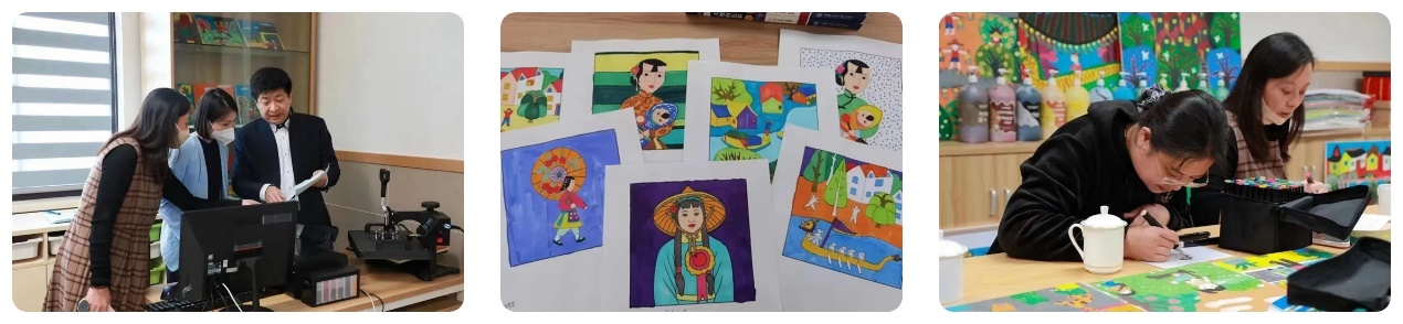 课堂的最后,侯老师指导同学们运用课堂所学知识创作了属于他们自己的农民画作品,并评选出优秀作品,用学校新引进的设备烫画机制作杯垫留念。