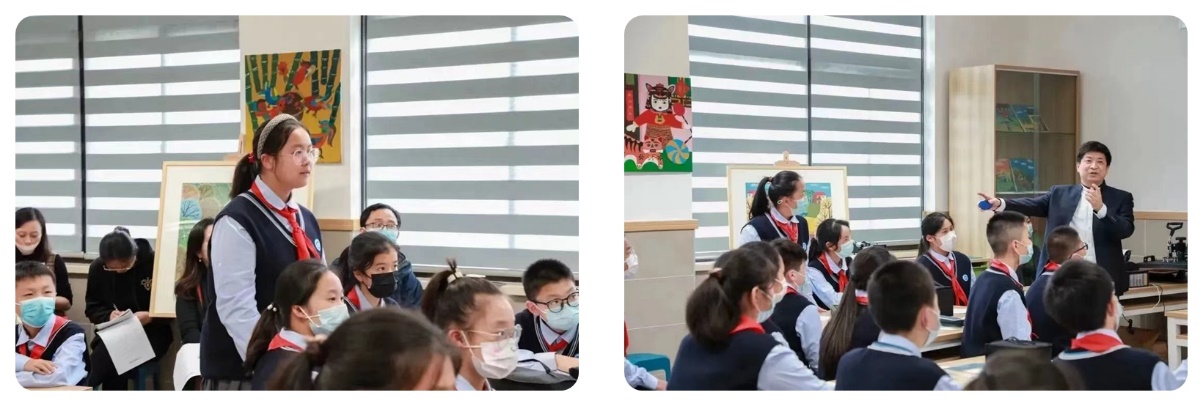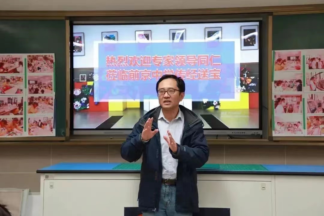 课堂展示结束后,侯老师就金山农民画教学开展微讲座,展示了前京中学目前已经完成和正在筹备的有关农民画的活动和项目计划,并表明前京中学想要担当非遗金山农民画传承传播者的决心。同时,他提出与时俱进的创新概念,指导学生将金山农民画的元素应用到各个方面,如软陶、衍生品制作、电子海报制作等。